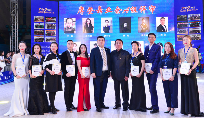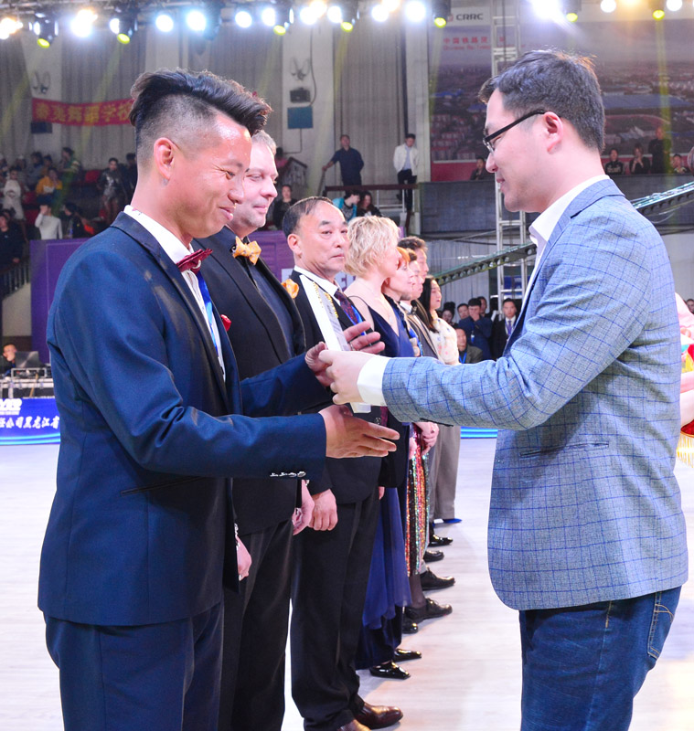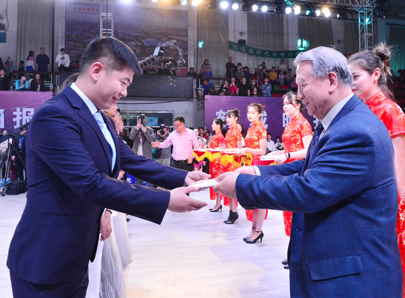 牡丹江远东体育舞蹈职业学校校长张佳先生与齐齐哈尔市远东舞蹈对外交流联合会秘书长黄晓伟先生为评审授牌并合影